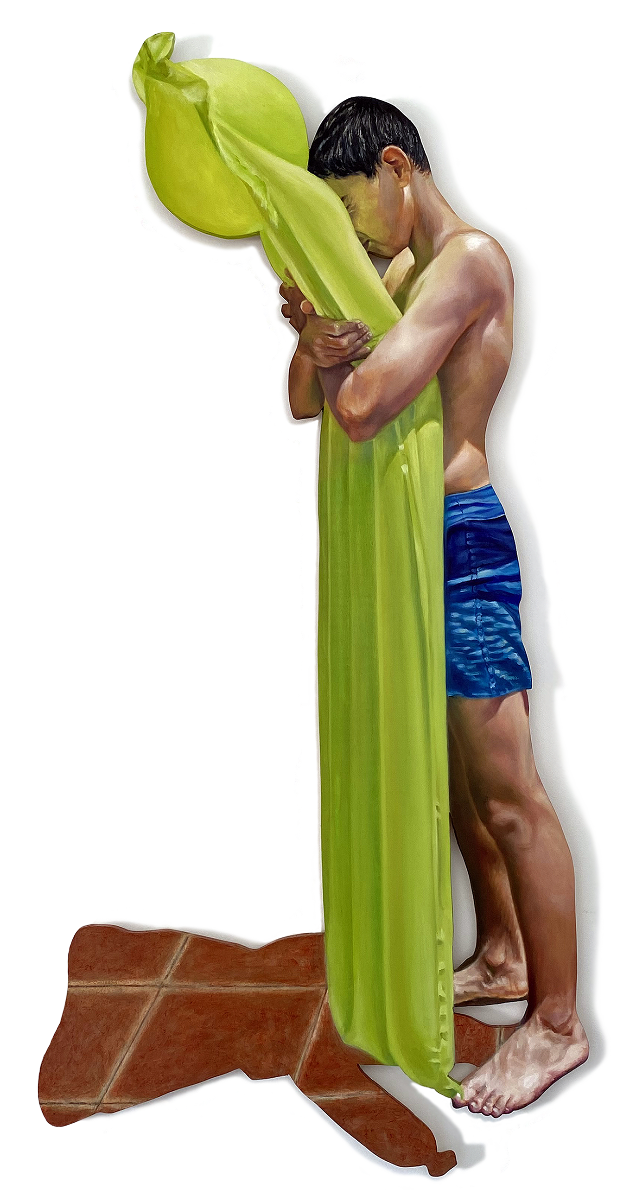 Esta pieza pertenece a la serie A FLOTE del proyecto pictórico "cAlma" formado por una cincuentena de óleos y una treintena de dibujos, collages y objetos-pintura . Dicho proyecto tiene un hilo narrativo y, en concreto, la serie A FLOTE muestra a varios personajes con distintos hinchables. Simboliza la necesidad que todos tenemos de asirnos fuertemente a aquello que nos hace continuar con nuestra existencia y darle sentido. Esa tabla de salvación, la colchoneta verde en este caso, será para unos la familia, para otros los amigos, el trabajo, la pintura o una mezcla de todo ello.